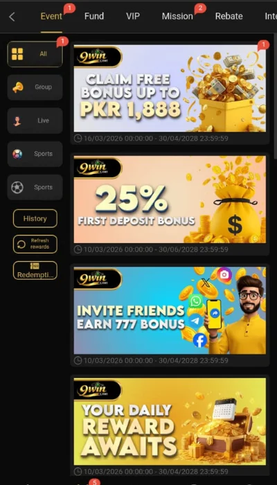 To deposit in the 9WIN earning game, open the wallet section and choose the deposit option. Select a payment method (JazzCash, Easy Paisa, or bank transfer), enter the amount, and confirm the request. The balance will update after processing.
